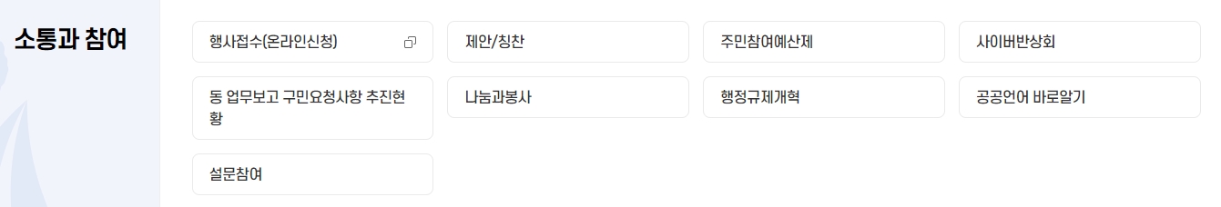 3. 소통과 참여 메뉴는 주민들의 의견을 수렴하고 참여를 독려하는 공간으로, 행사 접수, 제안/칭찬, 주민참여예산제, 사이버 반상회, 설문 참여 등의 기능이 포함되어 있습니다. 또한, 나눔과 봉사와 같은 사회 공헌 활동도 확인할 수 있습니다.