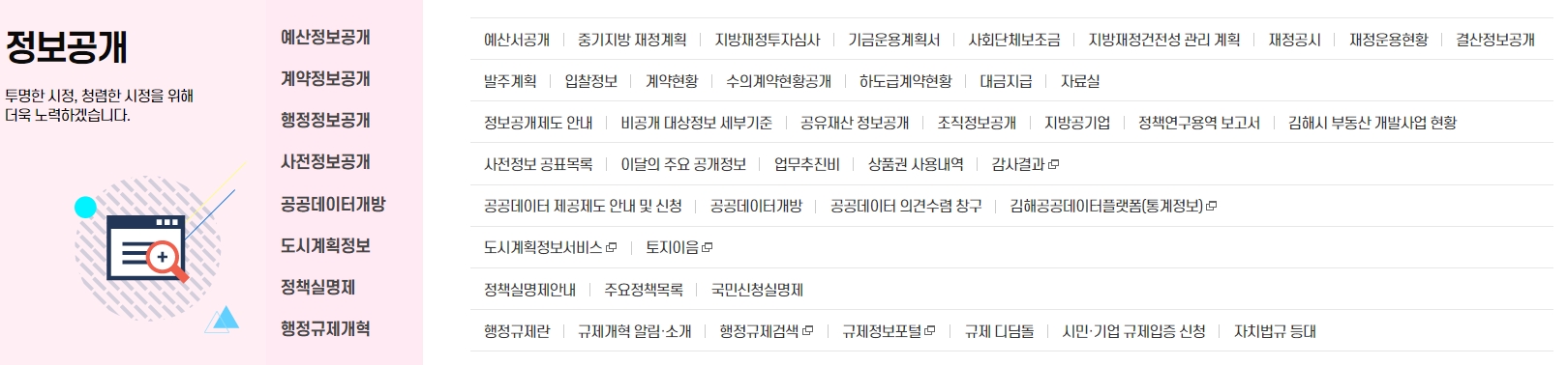 5. 정보공개 메뉴에서는 예산 및 재정 정보, 계약 정보, 행정 정보, 공공데이터 개방 등을 제공합니다. 도시 계획 정보나 정책 실명제 등의 자료도 공개되어 투명하고 신뢰할 수 있는 행정 운영을 보여줍니다.
