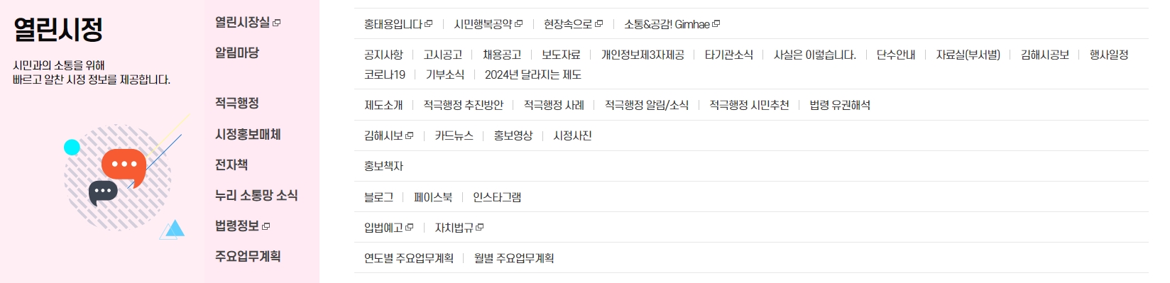 4. 열린시정 메뉴에서는 공지사항, 고시공고, 채용공고, 보도자료 등 김해시의 최신 정보를 확인할 수 있습니다. 또한, 시정 홍보물과 영상 자료를 통해 시정 홍보 활동을 쉽게 접할 수 있으며, 소셜미디어와 블로그를 통해 시민들과 소통을 강화합니다.