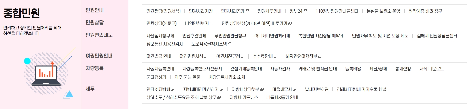 1. 김해시청 홈페이지는 경상남도 김해시 김해대로에 위치한 김해시의 주요 정보를 제공하는 사이트입니다. 이곳에서는 시정 주요 시책, 전자 민원창구, 사회복지, 관광 정보, 행정 서비스 등을 한눈에 확인할 수 있습니다.