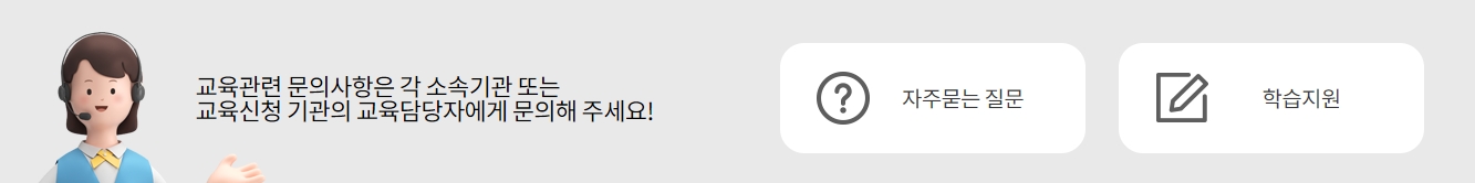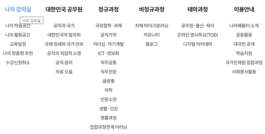 5. 나의 강의실 메뉴에서는 개인 맞춤형 학습 공간을 제공합니다. 나의 학습 공간, 교육 일정, 맞춤형 추천 강좌 등을 통해 학습자가 효율적으로 교육 과정을 관리할 수 있습니다. 수강 신청 취소 기능과 학습 이력을 확인할 수 있어 편리합니다.