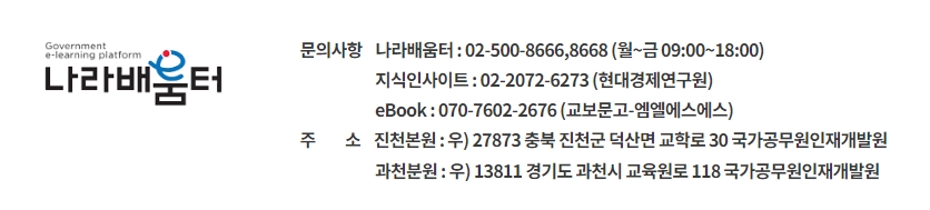 7. 문의 및 학습 지원 서비스는 자주 묻는 질문과 학습 지원 서비스를 통해 사용자들의 편의를 제공합니다. 홈페이지 하단에서는 나라배움터 운영 문의, 지식인사이트, eBook 관련 연락처와 진천 및 과천 분원의 주소를 안내하며, 사용자가 필요한 도움을 받을 수 있도록 지원합니다.
