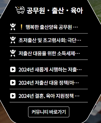 4. 공무원·출산·육아 관련 교육은 출산 및 육아를 지원하기 위한 정책과 정보들을 다루고 있습니다. 초저출산 및 초고령 사회에 대처하는 정책, 소득세제 지원, 결혼과 육아 관련 지원 정책 등 공무원의 가정생활과 밀접한 내용을 학습할 수 있습니다. 관련 커뮤니티를 통해 의견 공유도 가능합니다.