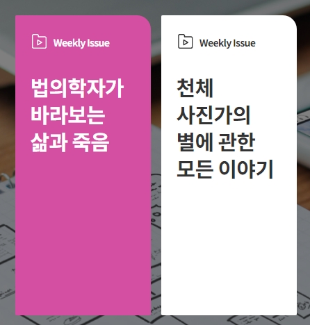 2. Weekly Issue 섹션에서는 법의학자가 바라보는 삶과 죽음, 천체 사진가의 별에 관한 이야기 등 흥미로운 주제를 다룬 콘텐츠를 제공합니다. 매주 새로운 주제로 학습자의 관심을 끌 수 있는 정보를 제공합니다.