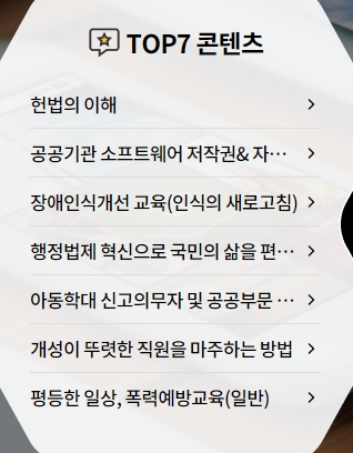 3. TOP7 콘텐츠 메뉴에서는 헌법의 이해, 공공기관 소프트웨어 저작권&자료관리, 장애인식개선 교육, 행정법제 혁신, 아동학대 신고의무자 교육, 개성이 뚜렷한 직원 대처 방법, 폭력 예방교육 등의 인기 강좌를 확인할 수 있습니다. 공무원들에게 필요한 실무와 윤리, 법적 지식을 제공하며, 다양한 직무 역량 강화를 지원합니다.