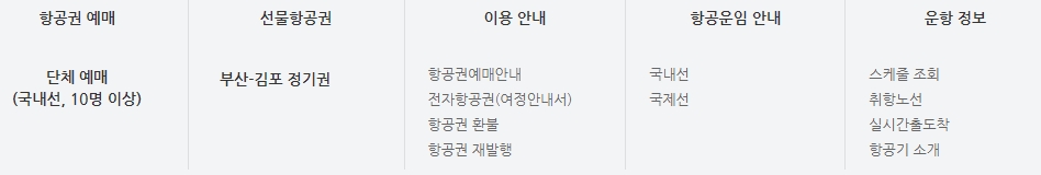 3. 항공권 예약 관련 섹션에서는 단체 예약(국내선 10명 이상), 선물항공권, 전자항공권 이용 안내, 항공권 환불 및 재발행 방법 등이 상세히 제공됩니다. 이를 통해 고객은 간편하게 예약을 관리하고 필요한 정보를 얻을 수 있습니다.