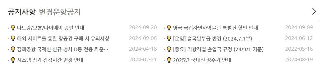 8. 공지사항 및 변경 운항 공지 섹션에서는 운항 변경, 시스템 점검, 공항 이용 규정 변경 등 중요한 정보를 제공합니다. 예를 들어, 특정 노선 운항 종료, 출입국 규정 변경, 성수기 운항 안내 등 고객이 알아야 할 최신 정보가 포함되어 있습니다.