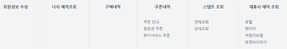 4. 회원 정보 수정, 나의 예약 조회, 구매 내역 확인, 항공권 쿠폰 및 부가서비스 쿠폰 관리 등 고객 개인화를 위한 다양한 기능이 제공됩니다. 스탬프 적립 및 조회 기능도 포함되어 있어 반복 이용 고객을 위한 혜택도 마련되어 있습니다.