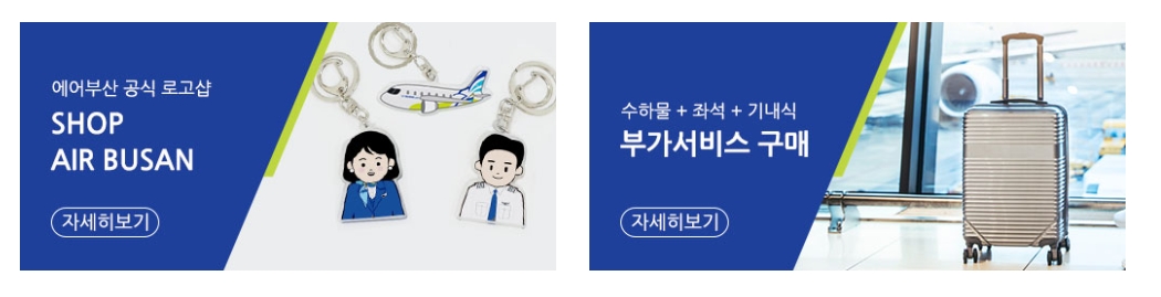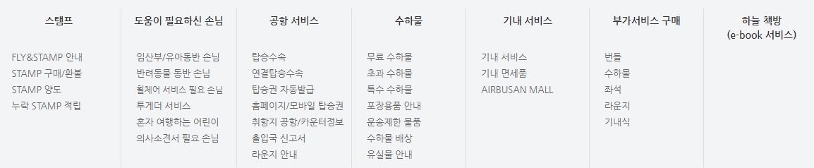 6. 기내 서비스 및 부가서비스 구매 섹션에서는 수하물, 좌석, 기내식 관련 추가 구매 옵션을 제공하며, 에어부산 공식 로고샵에서는 항공사 관련 상품을 구매할 수 있는 기능도 마련되어 있습니다.