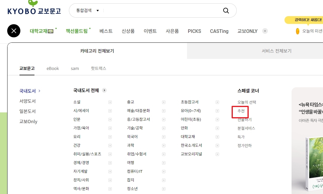 2. 홈페이지에 접속한 후 좌측 상단의 메뉴 버튼을 클릭하면 메뉴창이 열리며, 여기에서 스페셜 코너를 선택한 후 추천을 클릭하면 추천 도서와 관련된 페이지로 이동할 수 있습니다.