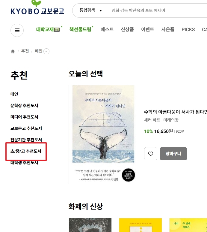 3. 추천 페이지에서는 좌측 메뉴에서 초/중/고 추천 도서를 클릭하여 세부 메뉴를 확인할 수 있으며, 이 중에서 청소년 권장도서, 교과서 수록 도서와 같은 분류를 선택하면 중학생들에게 적합한 책 목록을 찾아볼 수 있습니다.