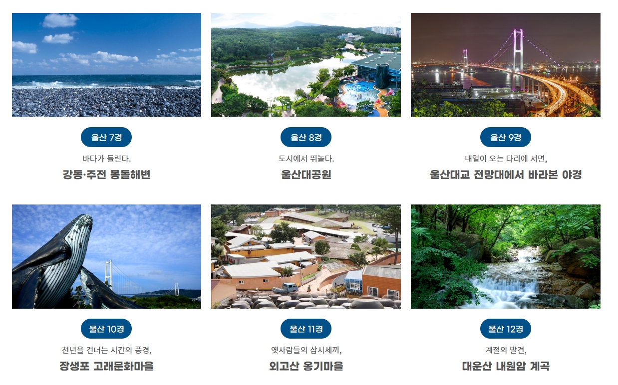 6. ‘울산 12경’은 지역의 대표적인 명소들을 모아놓은 리스트예요. 대왕암공원, 태화강 국가정원, 가지산 등 자연 풍경과 역사적인 장소들이 어우러져 있어서 꼭 한 번 정리해서 체크해보시는 걸 추천해요.