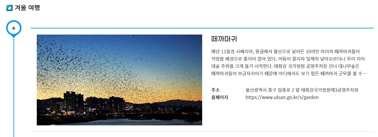 4. 겨울 시즌에는 꼭 ‘떼까마귀’ 항목을 확인해보세요. 매년 겨울이면 수많은 떼까마귀 떼가 태화강 주변을 날아다니는 장면이 펼쳐지는데, 해질녘 석양이랑 어우러지면 진짜 영화 속 한 장면처럼 멋지거든요.