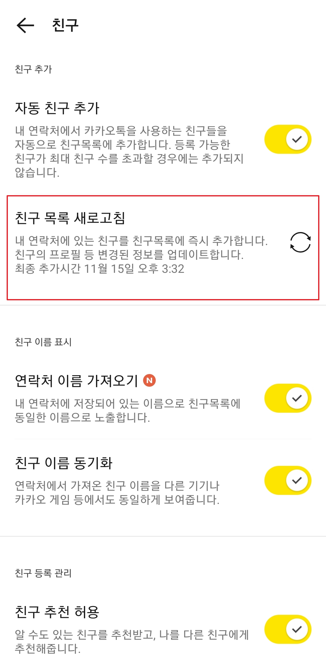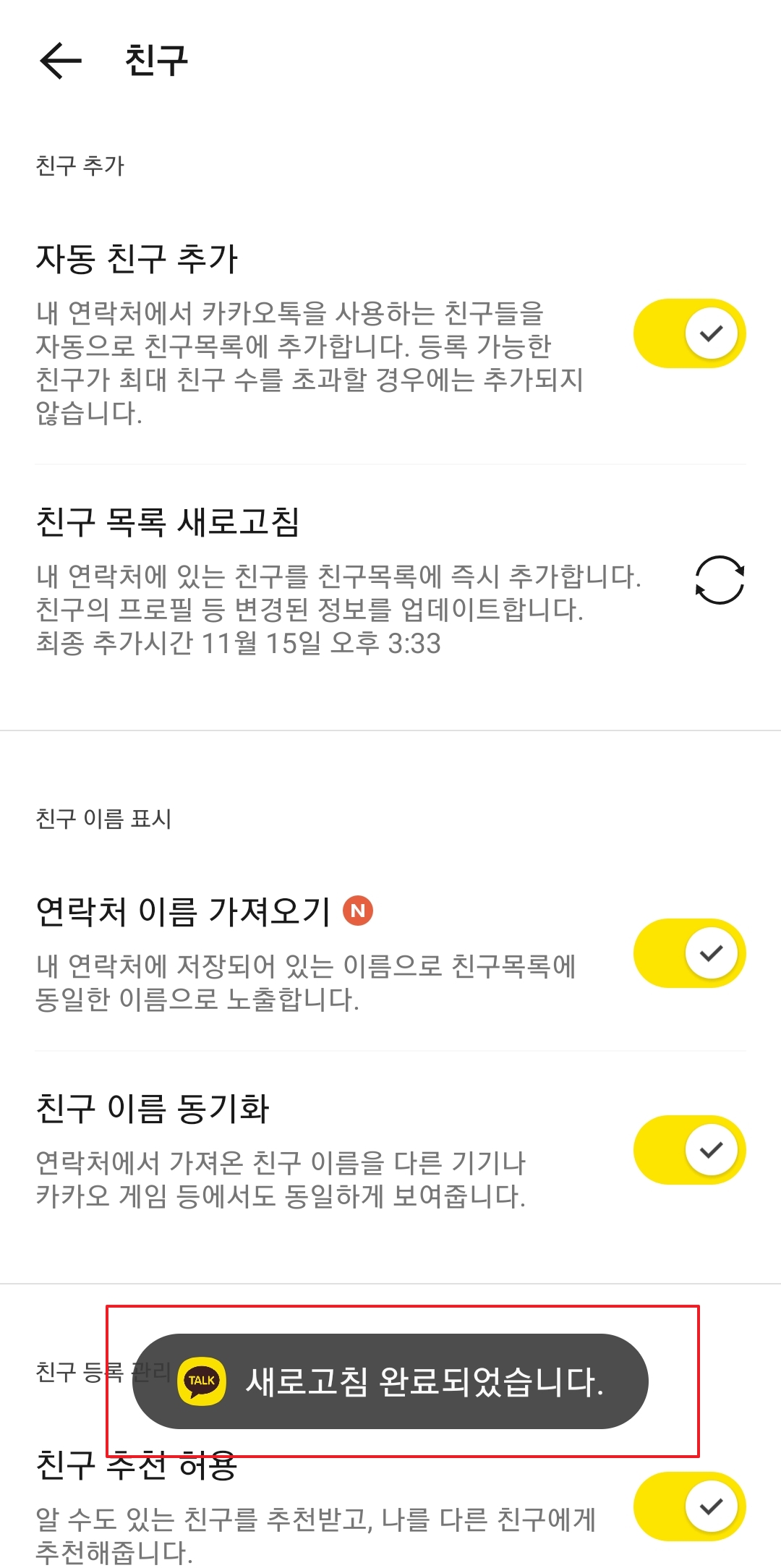 6. 상대방의 번호가 내 연락처에 저장되어 있다면, 자동 친구 추가 기능을 켜둔 상태에서 친구 목록 새로고침만 해도 자동으로 친구 추가가 됩니다. 혹시 추가가 안 되면, ‘친구 자동 추가’ 설정이 꺼져 있는 건 아닌지 확인해 보세요. 저도 예전에 이 설정 꺼둔 줄 모르고 한참 헤맨 적이 있거든요.