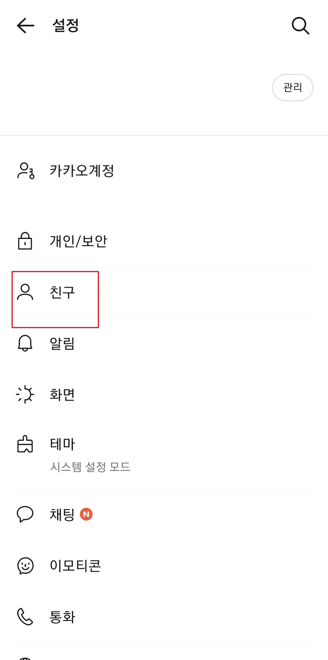 2. 설정 페이지로 이동하셨다면 그중에서 ‘친구’ 항목을 클릭해 주세요. 이 메뉴 안에서는 친구 자동 추가, 차단 관리 등 친구와 관련된 모든 설정을 한눈에 확인하고 조정할 수 있는 기능들이 모여있어요.