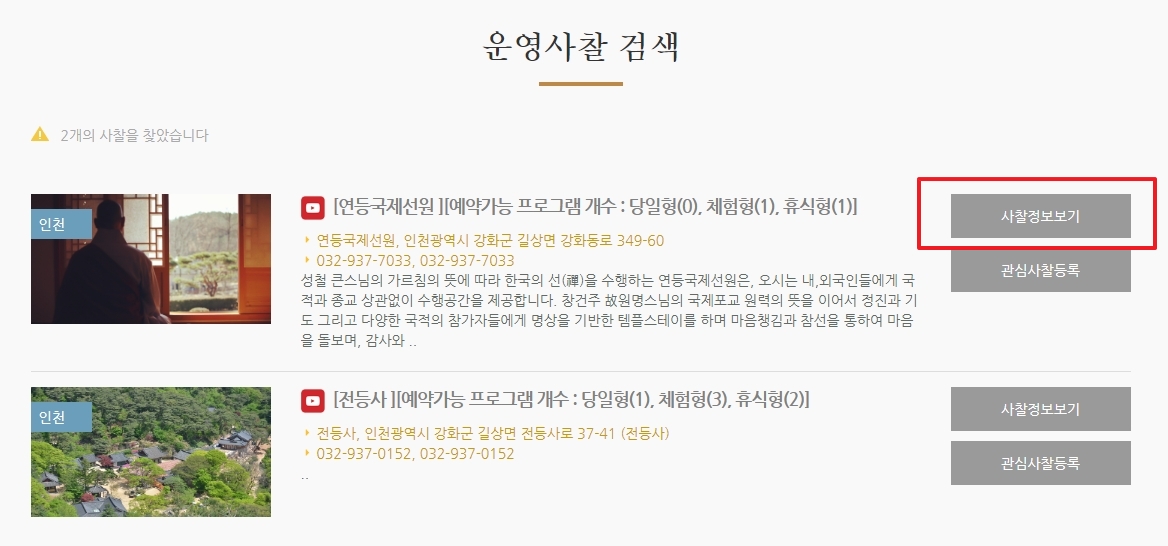 3. 검색 결과에서 관심 있는 사찰을 선택하면 사찰정보보기 버튼을 통해 상세 정보를 확인할 수 있습니다. 사찰의 주소, 연락처, 프로그램 종류 및 운영 방식에 대한 안내를 제공하며, 체험형, 당일형, 휴식형 등 프로그램 유형별 선택이 가능합니다.