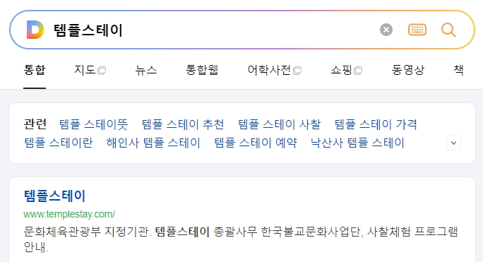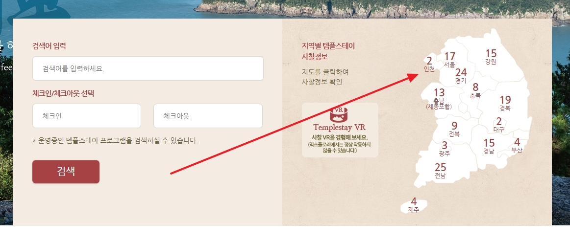2. 홈페이지 메인 화면에서 검색창에 원하는 사찰이나 지역을 입력하고, 체크인과 체크아웃 날짜를 선택한 후 검색 버튼을 클릭하면 해당 지역의 템플스테이 운영 사찰을 조회할 수 있습니다.