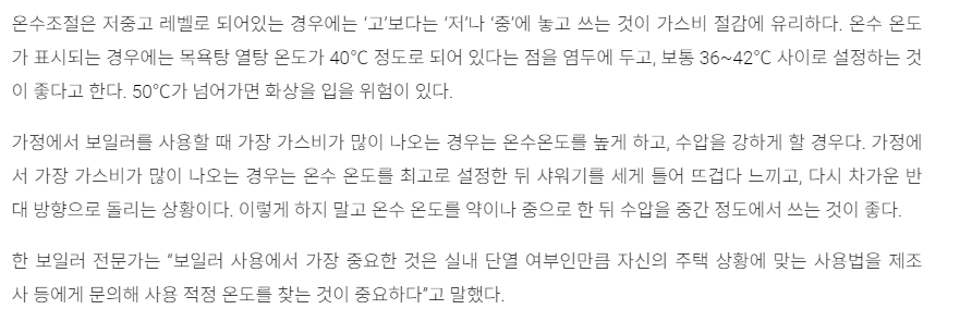 4. 기사 내용을 보면 온도 조절 팁이 구체적으로 나와 있는데요. 샤워할 때나 세면대 물을 사용할 때는 대략 40도 정도로 맞춰주는 게 피부에도 무리가 없고 에너지 낭비도 줄일 수 있다고 해요. 특히 겨울에는 약간 높여서 사용하는 게 좋고요, 여름철엔 낮게 조절해서 사용하면 불필요한 가스 소비를 피할 수 있습니다.