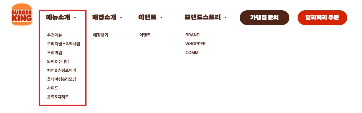 2. 홈페이지 상단 메뉴 중에서 ‘메뉴소개’ 탭을 클릭해보세요. 버거류부터 사이드, 디저트, 음료까지 종류별로 보기 쉽게 정리되어 있어서 눈에 잘 들어와요. 사진도 큼직하게 나와서 메뉴 고르는데 훨씬 도움이 되더라고요.