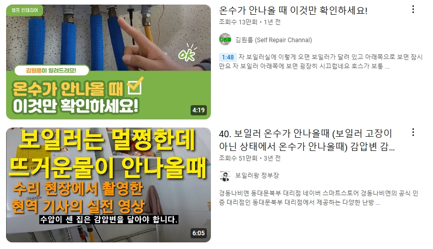 2. 검색 결과에 뜨는 영상 중에는 보일러가 정상 작동함에도 온수가 안 나올 때 꼭 확인해야 할 몇 가지를 알려주는 영상들이 있어요. 예를 들어 온도 조절기 세팅, 수압 상태, 가스 공급 체크 방법 같은 것들이고, 실제로 많은 분들이 이 영상들 보고 문제를 해결했다고 하더라고요.