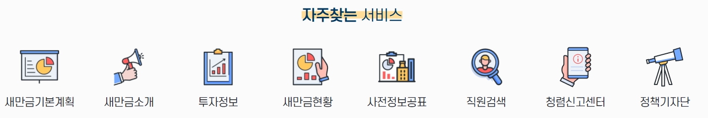 10. ‘자주 찾는 서비스’ 메뉴는 홈페이지에서 꼭 체크해보셔야 해요. 새만금 계획서, 관련 부서 연락처, 민원 신청까지 핵심 기능들이 다 모여 있어서 찾는 정보가 있다면 이쪽에서 제일 빠르게 접근 가능하더라고요.