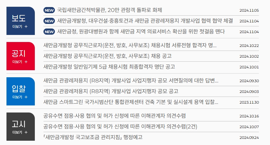 9. 새만금 관련 최신 뉴스도 놓치지 마세요. 공지사항은 물론이고 입찰 정보, 고시 등 각종 행정 소식까지 빠르게 업데이트되니까 이쪽 정보 놓치면 아깝죠. 자주 들어가보는 게 좋을 것 같아요.