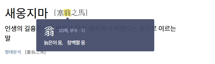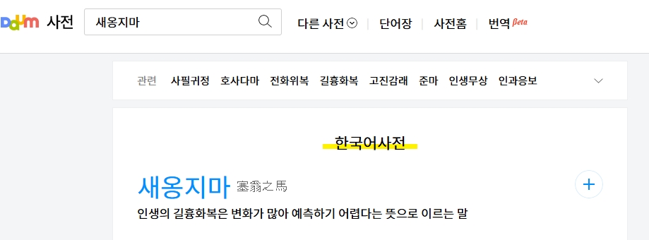 3. 검색 결과 페이지에서 새옹지마를 클릭해주세요. 그러면 단어의 정의뿐만 아니라, 이 표현이 어떤 상황에서 자주 쓰이는지, 어떤 의미로 활용되는지까지 한눈에 볼 수 있게 정리되어 나옵니다.
