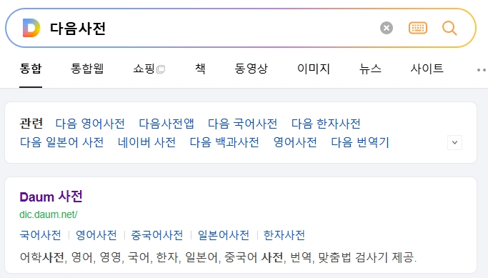 1. 먼저 다음사전 사이트에 접속해주세요. 이곳은 단어에 대한 정확한 의미와 함께 자세한 설명, 관련 속담이나 예문까지 확인할 수 있는 좋은 자료실 같은 곳이에요. 찾고 싶은 단어가 있다면 이만한 곳이 잘 없죠.