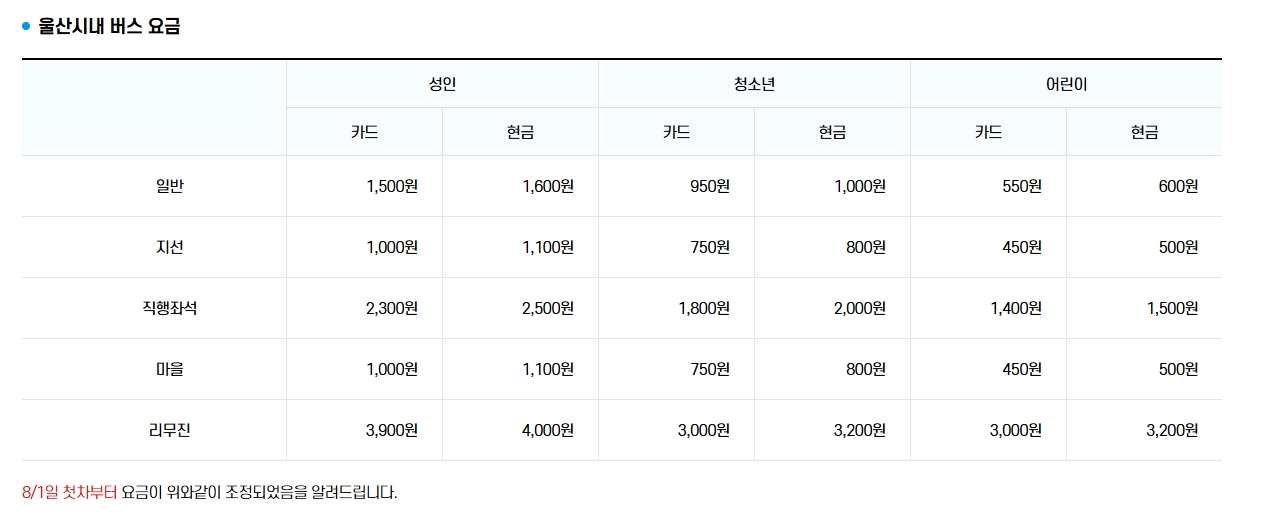 울산 시내버스 기본 요금은 버스 종류에 따라 달라집니다. 일반인은 일반버스 카드1500원 현금1600원이며 직행좌석 카드2300원 현금2500원, 시계외 직행(1127·1137·1147) 카드2900원 현금3100원입니다. 리무진 카드3900원 현금4000원이고 지선·마을버스 카드1000원 현금1100원입니다.