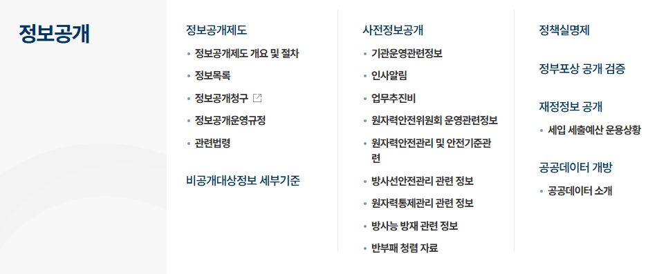 2. 홈페이지 상단 메뉴에서 정보공개를 클릭해보세요. 이곳에서는 정부가 보유한 다양한 정보를 국민에게 투명하게 공개하고 있는데요, 평소 궁금했던 방사선 안전 기준이나 기관 운영 정보 등을 한눈에 확인할 수 있어서 정말 유용합니다.