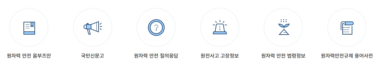 7. 메인 화면 아래쪽에 보이는 아이콘들을 클릭해보세요. 국민신문고, 원자력 안전 질의응답 같은 유용한 서비스들이 모여 있어서 필요할 때 빠르게 접근할 수 있습니다. 꼭 필요한 정보들을 쉽게 찾을 수 있어서 정말 편리하더라고요.