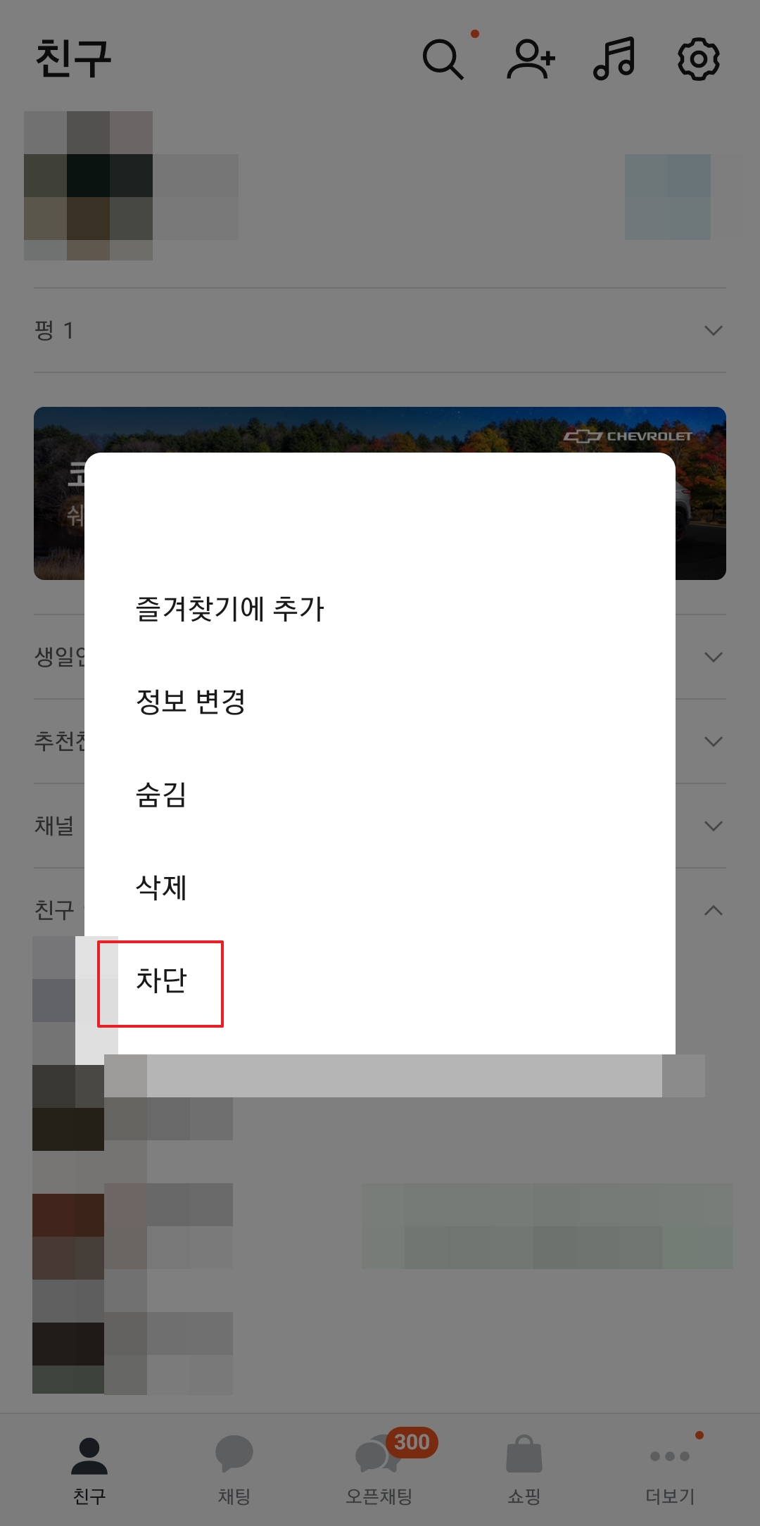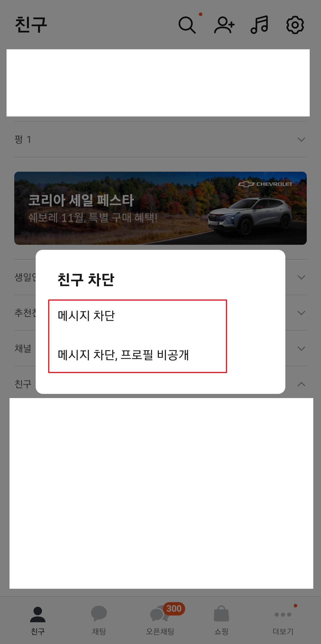 3. 팝업 메뉴가 뜨면 차단을 선택해 주세요. 이때 단순히 메시지 차단만 할지, 아니면 프로필까지 가릴지 선택할 수 있습니다. 상대방이 내 정보를 볼 수 없게 설정하는 기능이라서 개인정보 보호에 유용하답니다.
