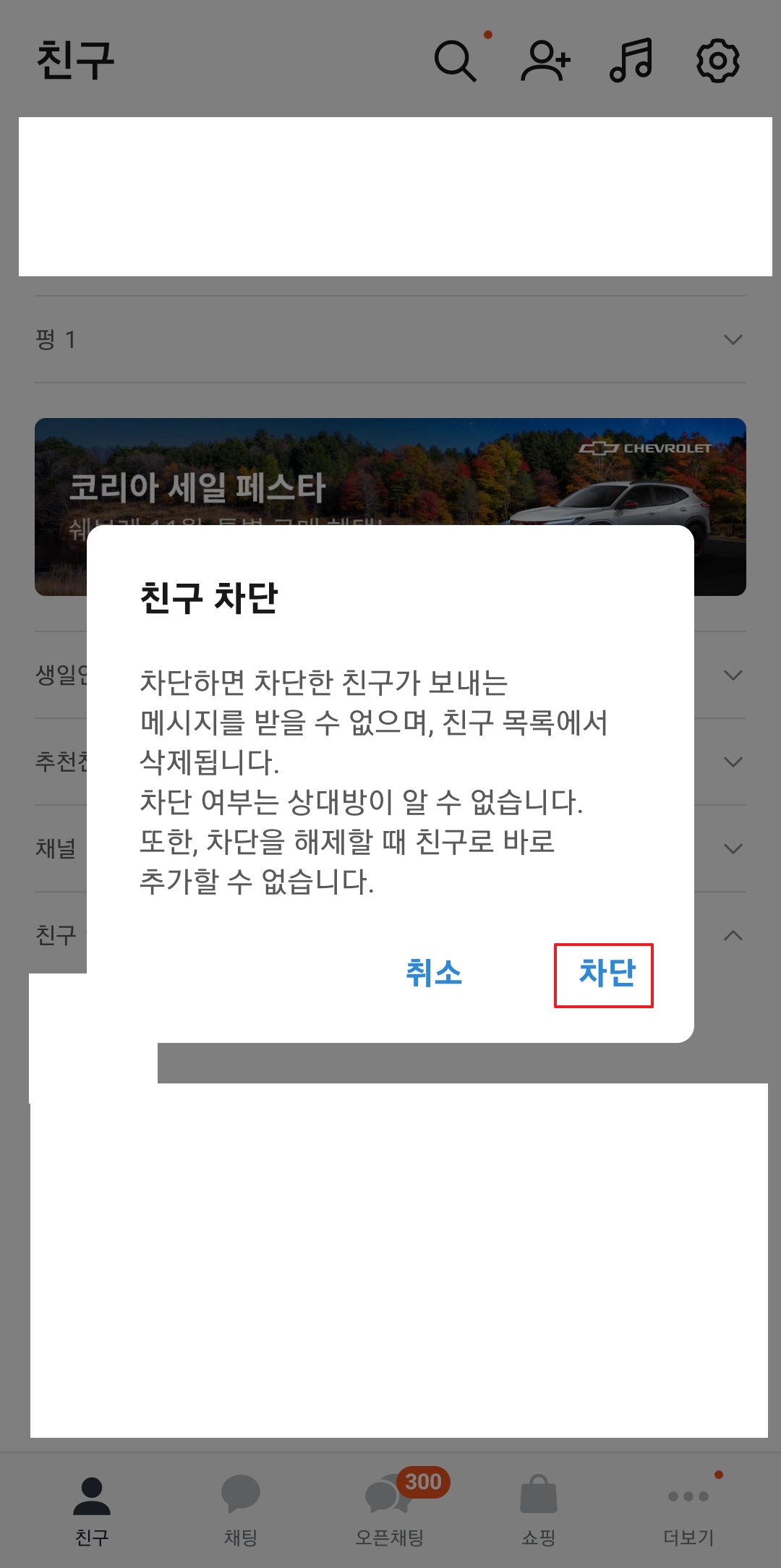 4. 차단을 누르기 전에 마지막으로 확인창이 뜨는데요, 여기서 한 번 더 생각해보고 결정하세요. 차단을 완료하면 해당 친구는 더 이상 내 프로필이나 상태 메시지를 볼 수 없고, 대화도 차단됩니다.