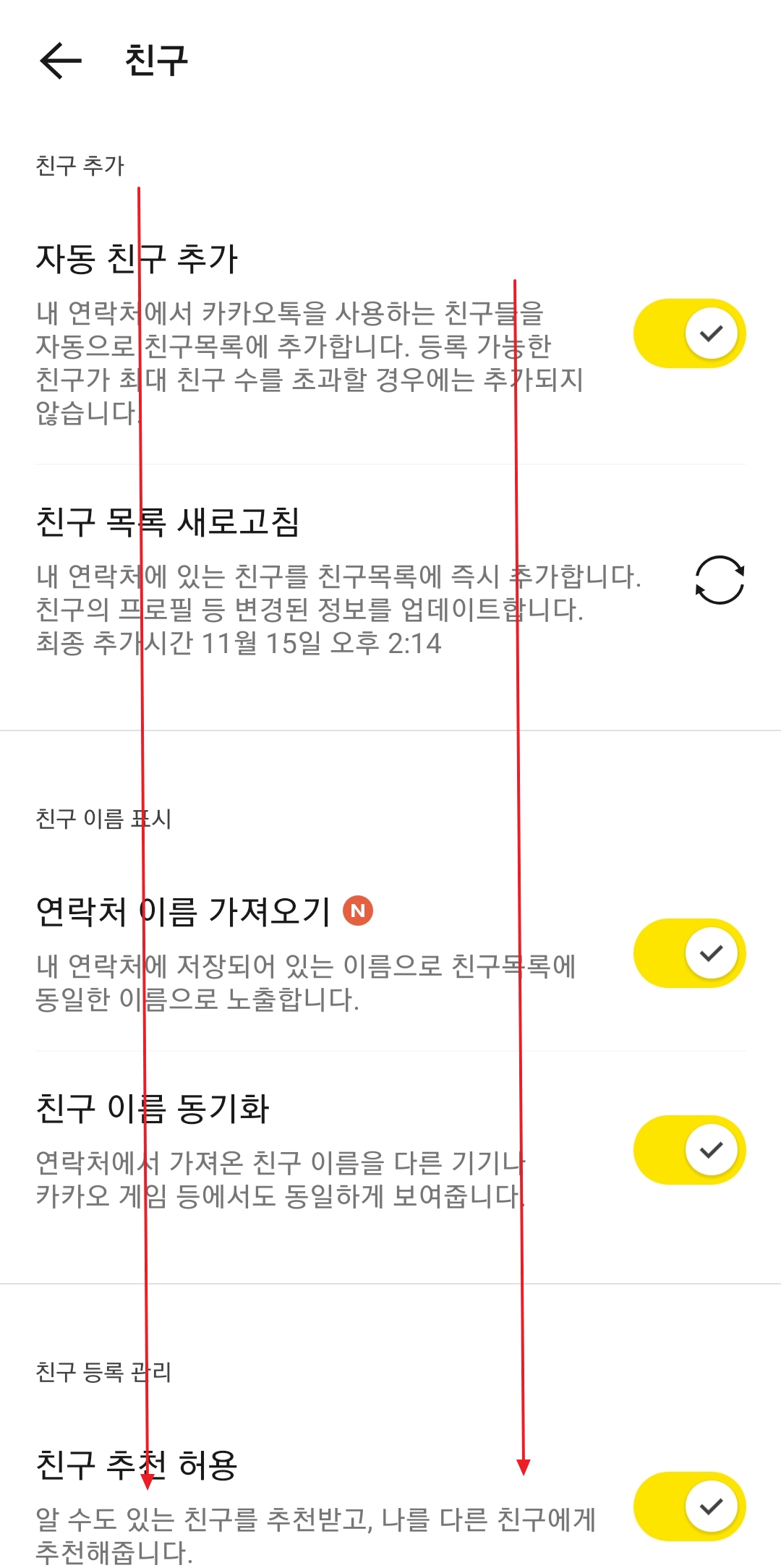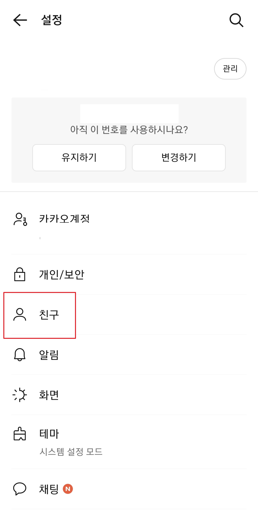 7. 설정 메뉴가 열리면 친구 항목을 찾아 클릭해 주세요. 친구와 관련된 다양한 관리 기능들이 이 안에 다 모여 있어서 찾기 쉽답니다.