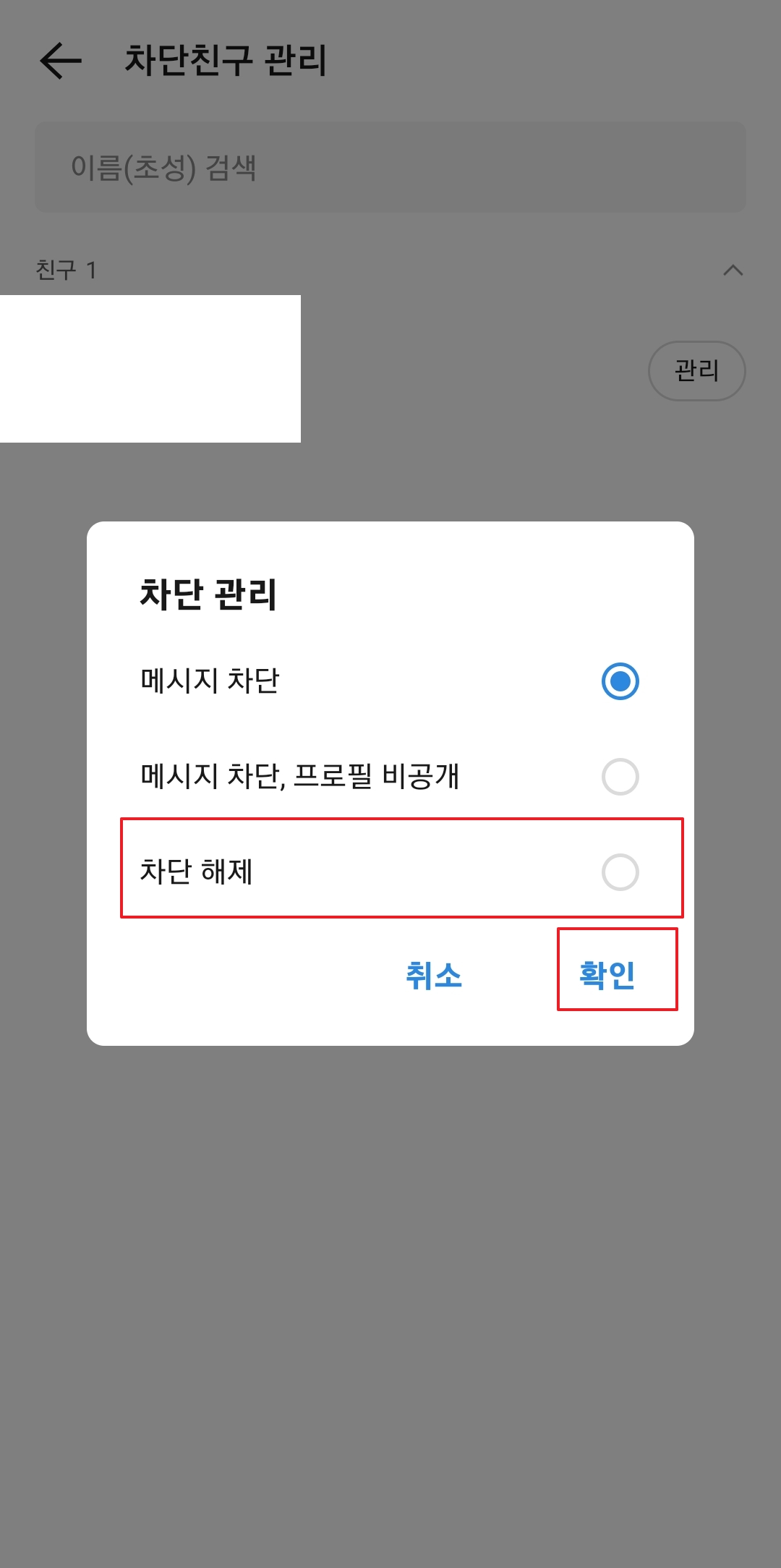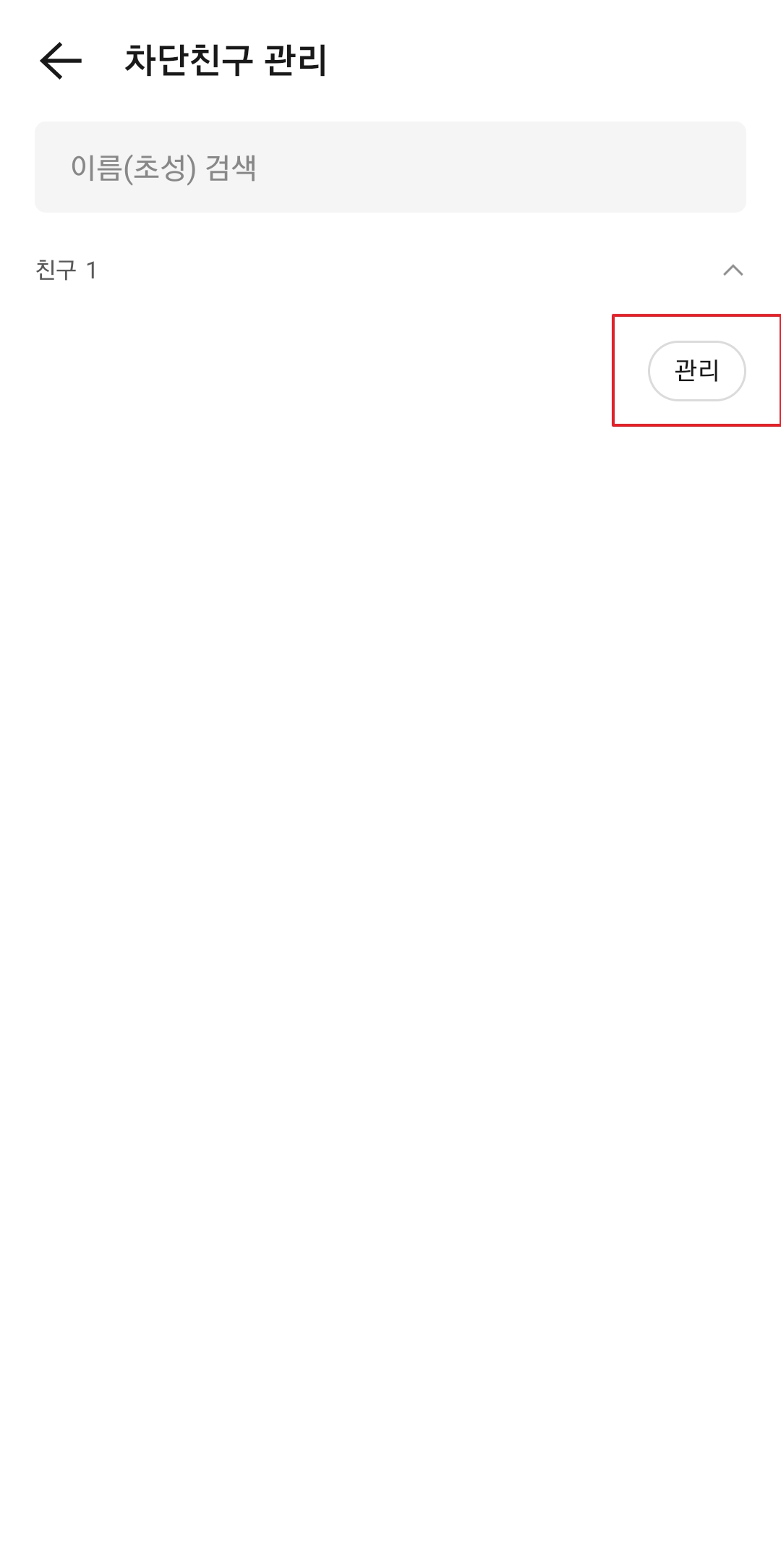 9. 차단된 친구 리스트가 보이면, 삭제하고 싶은 친구 옆에 있는 관리 버튼을 눌러주세요. 이 버튼을 통해 해제할지, 그대로 둘지 선택할 수 있는 창이 뜹니다.