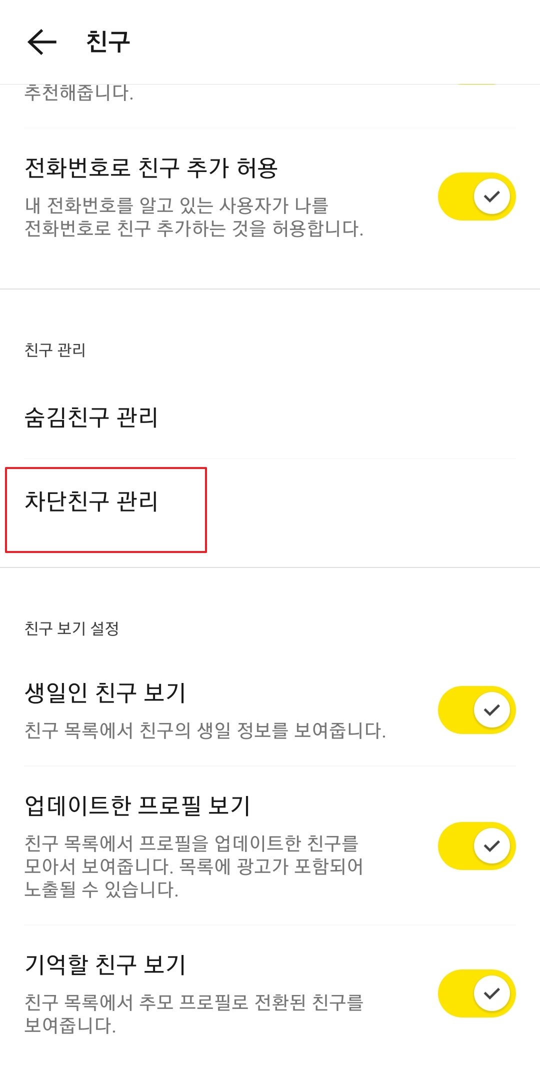 8. 친구 메뉴 안으로 들어가면 아래쪽에 차단 친구 관리라는 항목이 보일 거예요. 여기를 통해 지금까지 차단해둔 친구 목록을 확인할 수 있어요. 정리가 필요할 때 자주 사용하는 기능이죠.