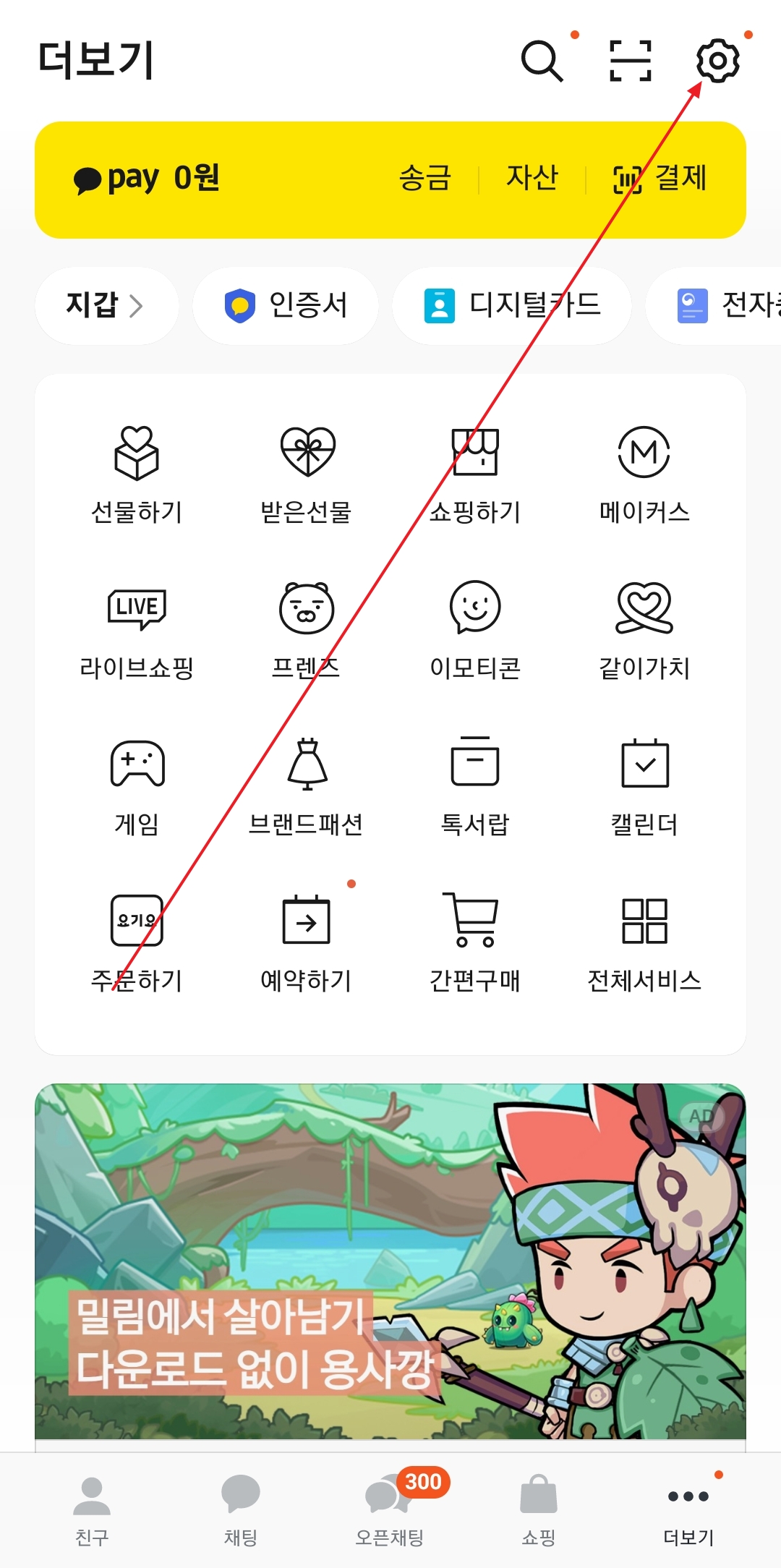 6. 더보기 메뉴에 들어갔으면, 화면 오른쪽 위 톱니바퀴 아이콘 보이시죠? 이걸 눌러서 설정으로 들어가 주세요. 여기서 카톡의 세세한 기능들을 조정할 수 있답니다.