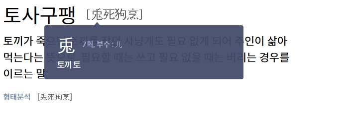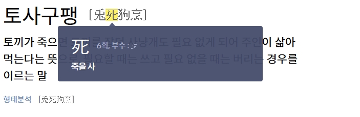 2. 상단의 검색창에 토사구팽이라고 입력해 주세요. 그러면 바로 이 사자성어에 대한 자세한 설명이 나오는데요, 단순한 뜻뿐만 아니라 유래나 사용 예시까지 확인할 수 있어서 이해가 훨씬 쉬워집니다.