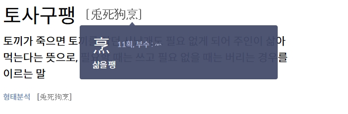 6. 마지막으로 烹은 삶는다는 의미예요. 음식을 조리할 때 쓰이는 글자인데, 여기선 필요가 끝난 뒤 가차 없이 처리된다는 의미로 사용돼요. 조금 무섭게 느껴질 수도 있겠네요.