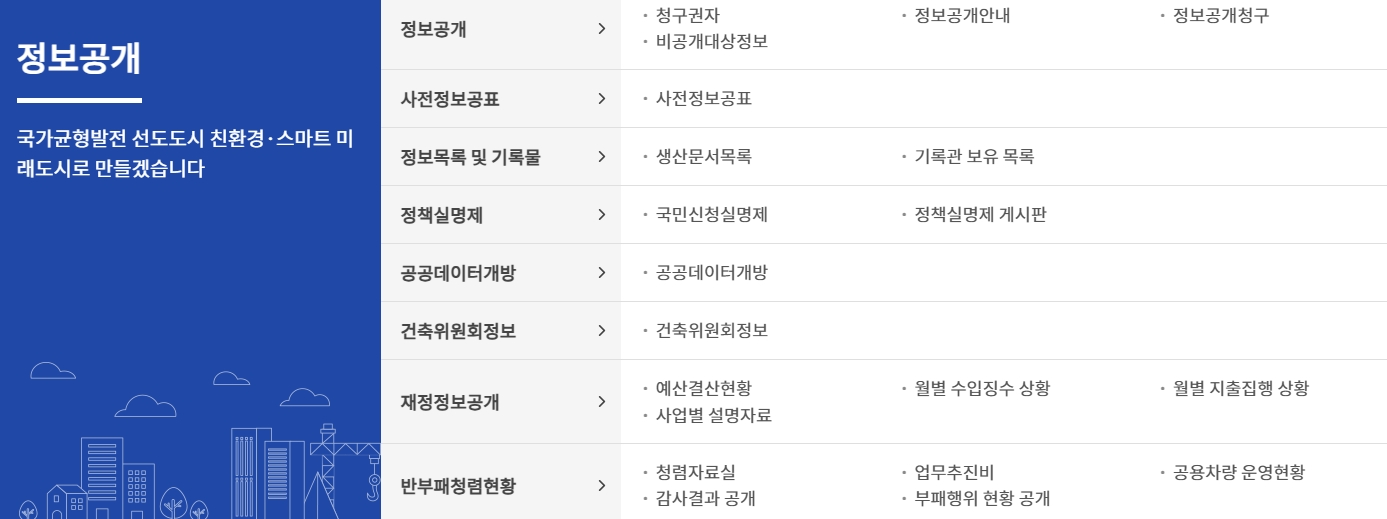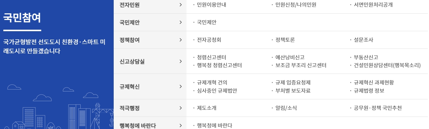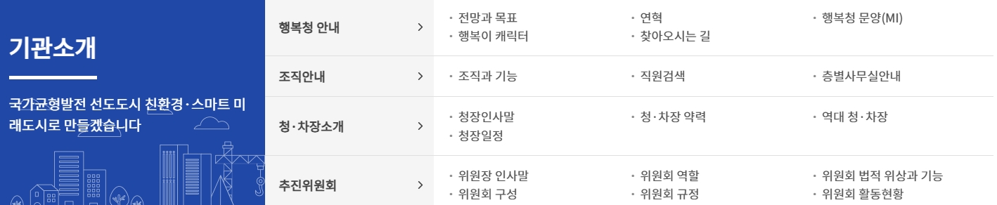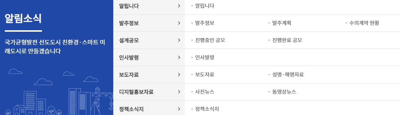 행정중심복합도시건설청 홈페이지는 세종특별자치시를 비롯한 새로운 행정중심복합도시 개발 과정을 한눈에 볼 수 있도록 구성돼 있어요. 첫 화면에는 주요 사업 로드맵과 최신 공지사항이 배치돼 있어, 방문한 즉시 전체 개발 현황을 파악할 수 있습니다.