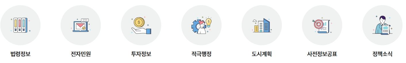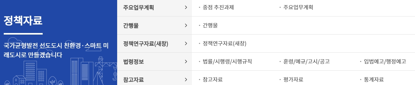 상단 메뉴에는 정책·계획, 사업현황, 민원·전자공간 등이 마련돼 있어요. 정책·계획 메뉴에서는 법령과 시행지침, 중장기 개발 방침 같은 문서를 단계별로 확인할 수 있고, 사업현황에서는 진행 중인 토지 조성, 기반 시설 공사 일정과 완료 보고서를 살펴볼 수 있습니다.