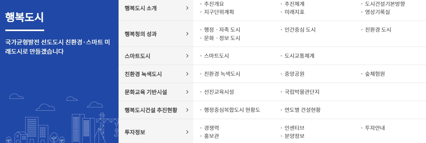 2. 홈페이지에서 행복도시 소개 메뉴로 이동하면 세종시가 어떤 목표로 만들어졌는지, 앞으로 어떤 모습으로 발전할지에 대한 내용을 자세히 확인할 수 있습니다. 도시의 비전과 함께 다양한 참고자료도 준비되어 있어요.