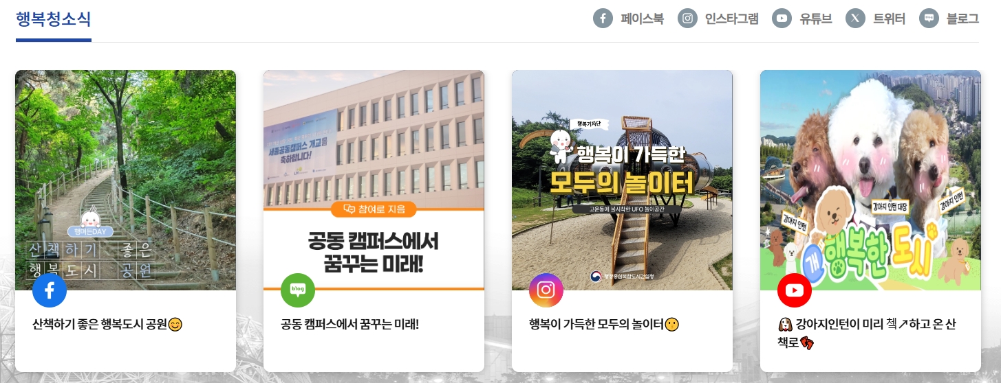 9. 마지막으로 소식 및 홍보 코너에서는 세종시와 행복청의 다양한 이벤트, 공모전 소식, 그리고 알찬 영상 자료들을 만나볼 수 있어요. 주민들과의 소통 창구 역할도 톡톡히 하고 있답니다.