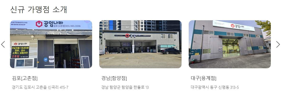 3. 이번에는 홈페이지 상단에 있는 전국 지점 찾기 메뉴를 클릭해봅니다. 이 기능을 이용하면 내 위치랑 가까운 공임나라 정비소를 손쉽게 찾을 수 있어요. 지역별로 필터링도 가능하고, 지도에서 직접 확인하면서 골라볼 수도 있습니다. 김포, 대구, 경남 함양 같은 지역에 새로 오픈한 신규 지점도 별도로 소개돼 있어서, 새 지점을 이용해보고 싶은 분들한테도 유용합니다.
