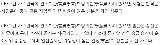 5. 추가로 관귀학관이 있는 사람의 특징도 설명하고 있어요. 시험에 합격하거나 사회적으로 크게 인정받을 가능성이 높다고 해요. 그래서 공무원 시험 준비하거나 연구직에 관심 있는 분들이 자신의 사주에 관귀학관이 있는지 궁금해하는 경우도 많다고 합니다. 저도 읽으면서 괜히 사주 한 번 보고 싶어졌어요.