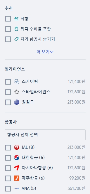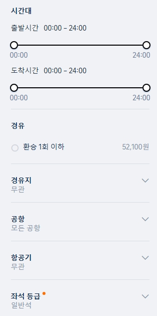 5. 검색이 완료되면 다양한 항공권 목록이 나와요. 여기서 출발 시간, 도착 시간, 항공사 종류, 직항 또는 경유 여부 같은 필터를 활용해서 자신에게 맞는 항공권만 쏙쏙 골라볼 수 있어요. 조건이 많은 분들에게는 이 필터 기능이 정말 유용하답니다.