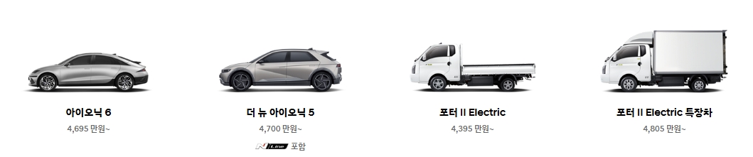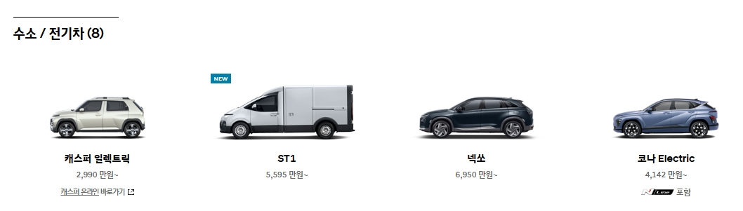 3. 전기차 및 수소차 항목을 눌러보면 친환경 차량 목록이 나옵니다. 아이오닉 시리즈나 코나 일렉트릭 같은 모델 외에도, 상용 전기차와 도시형 차량도 소개되어 있어요. 가격 정보도 같이 나와서 비교해보기 딱 좋습니다.