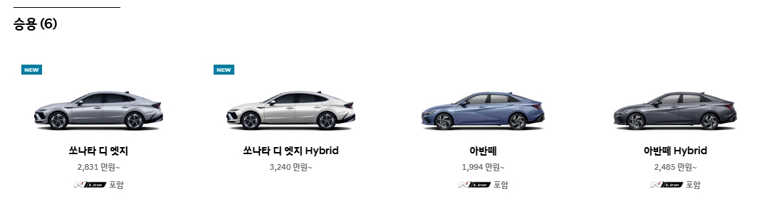 5. 승용 항목도 꼭 살펴보세요. 아반떼나 쏘나타 같은 익숙한 모델부터 하이브리드 버전까지 다양하게 나와 있고, 실내 공간, 연비, 디자인 등을 기준으로 비교해볼 수 있어서 가족 단위나 출퇴근용 차량 고르시는 분들께 좋습니다.