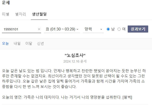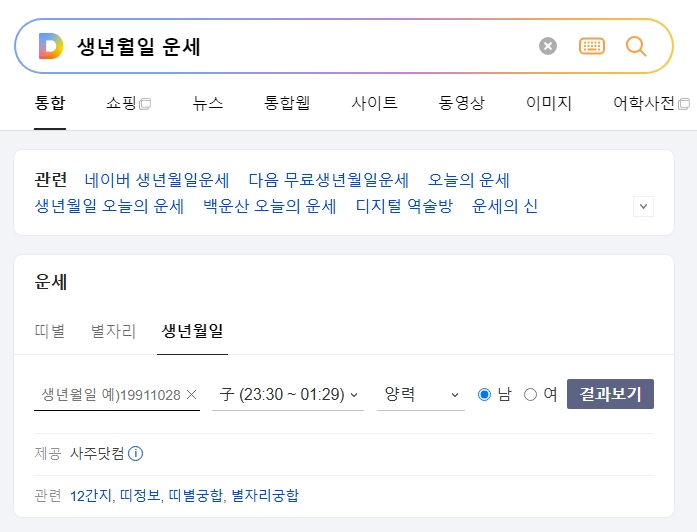 다음 포털에서는 생년월일을 바탕으로 간단한 사주풀이와 운세를 무료로 제공하고 있어요 띠별 운세부터 한 해 전체 흐름, 월별 세부 운세까지 다양한 정보를 한눈에 확인할 수 있습니다