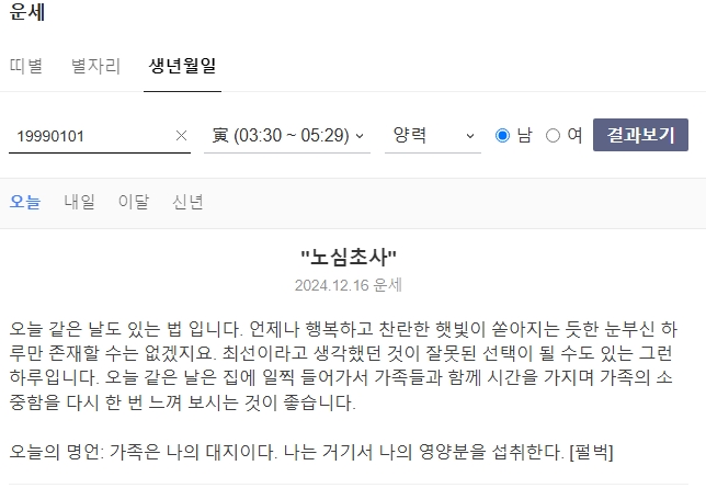 1. 다음 검색창에 생년월일 운세라고 쳐보세요! 그러면 다양한 무료 운세 사이트가 주르륵 뜨는데요, 그 중 마음에 드는 곳 하나 골라 들어가면 됩니다. 보통 생년월일, 태어난 시간, 성별, 양력 또는 음력을 선택하라고 나오는데요. 입력은 1분도 안 걸려서 간편하게 운세를 확인할 수 있어요. 별 부담 없이 재미삼아 이용하기 정말 좋은 구성입니다.